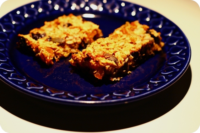 Viel einfacher (und viel leckerer) geht es wahrscheinlich nicht: einfach alle Zutaten vermengen, auf ein Blech patschen, zu einem Viereck verstreichen in ‚Müslihöhe‘ eben, nach der Hälfte der Backzeit mit einem Pizzaroller die Masse in ca. 18 Stücke schneiden, ausbacken, auskühlen lassen, essen =) Merke: Da ich schätze, dass die Backtemperatur im Originalrezept für Umluft gedacht ist, habe ich mal ergänzt, dass man sonst 200° nehmen sollte. Wer dieses Rezept auch einmal ausprobieren möchte: